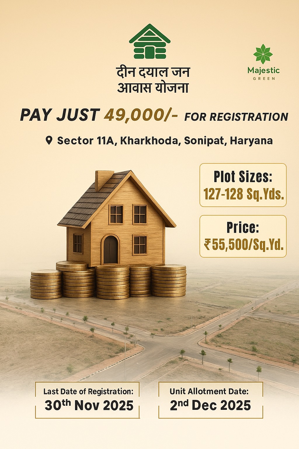 Deen Dayal Jan Awas Yojna, an affordable housing scheme of state Government of Haryana has been launched by Prime Minister Narendra Modi on 1st November on Haryana Golden Jubilee Day. Investing in Deen Dayal Jan Awas Yojana (DDJAY) plots is a smart and secure decision that promises high returns with low risk. These fully developed properties come with attractive amenities, and the DDJAY policy of the Haryana government allows for separate registration and an easy process for building additional floors. All of these features make DDJAY plots a valuable residential asset for comfortable living, a relaxing holiday destination, or a profitable source of income if you decide to build additional floors to sell or rent.